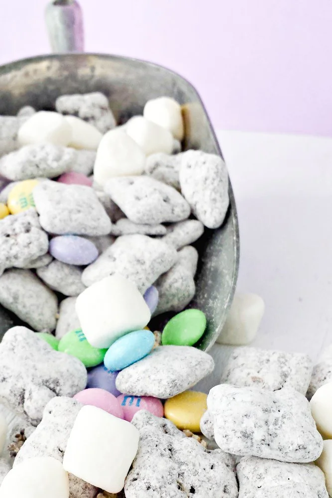 A mixture of mini bunny cookies, chocolate dots, organic cereal coated in semi sweet chocolate and peanut butter, shaken in powdered sugar, chocolate dots, and Easter sprinkles 🐇❤️ A fun treat for your little Easter Bunnies!